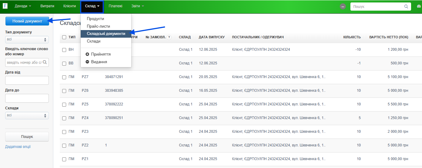- перейдіть до закладки Склад > Складські документи > Новий документ;