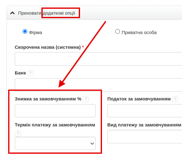 - визначте Знижку за замовчуванням % та Термін платежу за замовчуванням