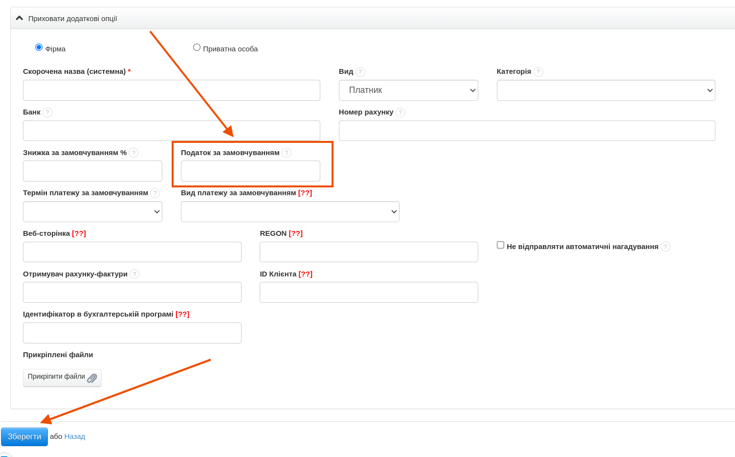 Щоб призначити податок за замовчуванням для клієнта, потрібно вибрати вкладку "Клієнти" з верхнього меню. Залежно від потреб, виберіть раніше створеного клієнта (шестерня з правого боку > Редагувати) або додайте нового (бічна панель з лівого боку "Додати клієнта").  На рівні картки клієнта розгорніть закладку Інші опції. Далі шукаємо рубрику "Податок за замовчуванням". У це поле потрібно ввести податок, який має застосовуватися для конкретного контрагента. Зміни зберегти, натиснувши синю кнопку "Зберегти" внизу сторінки.  З моменту призначення податку за замовчуванням клієнту в документах, виданих після введення продукту, значення в полі податку автоматично зміниться на значення, призначене клієнту. Наприклад: Якщо сам продукт у картці продукту матиме ставку ПДВ 20%, то при створенні нового рахунка-фактури, після додавання клієнта з призначеною ставкою ПДВ 5%, усі продукти будуть автоматично додаватися зі ставкою, зазначеною в картці цього клієнта.