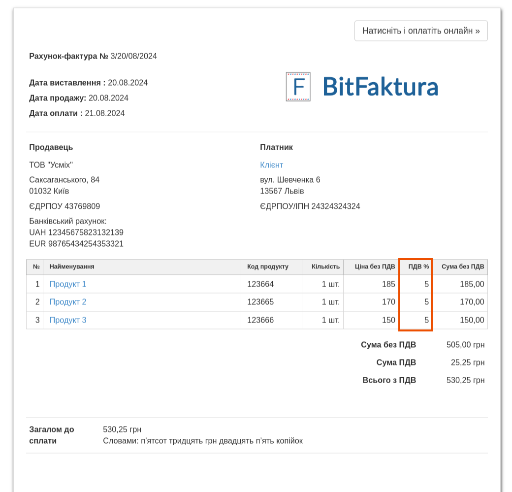 У BitFaktura є можливість скористатися опцією призначення податку для клієнта. Завдяки цій функції ми можемо легко призначити відповідні ставки ПДВ для контрагентів. Це дозволяє зберегти в системі стандартний податок, який буде застосовуватися тільки для цього клієнта, незалежно від того, який податок призначено в картці продукту. Ставка за замовчуванням у картці клієнта має пріоритет над ставками, зазначеними в картці продукту.