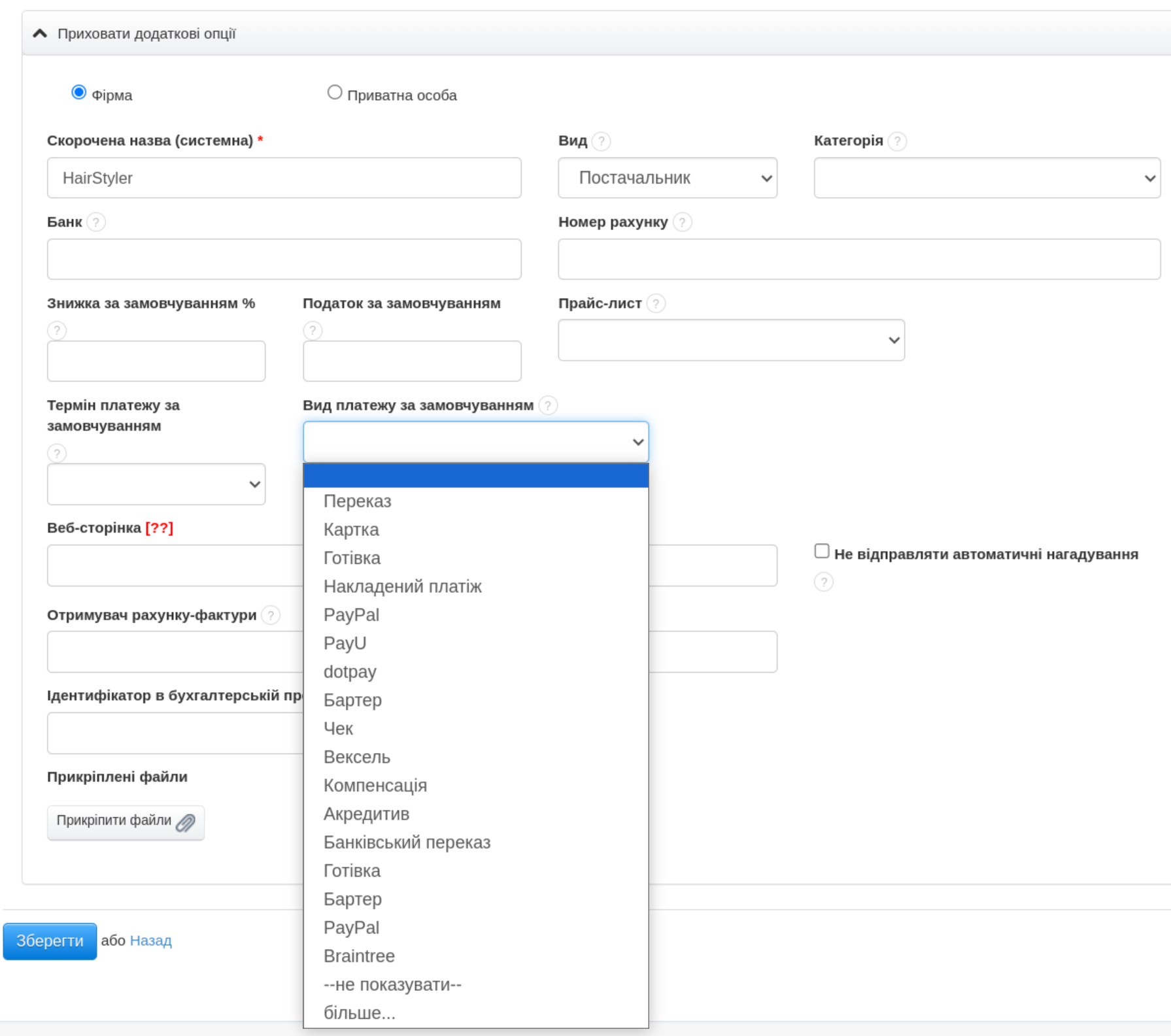 - у формі створення/редагування клієнта перейдіть до розділу "Інші опції" (або "Сховати додаткові опції", якщо вони вже розгорнуті),