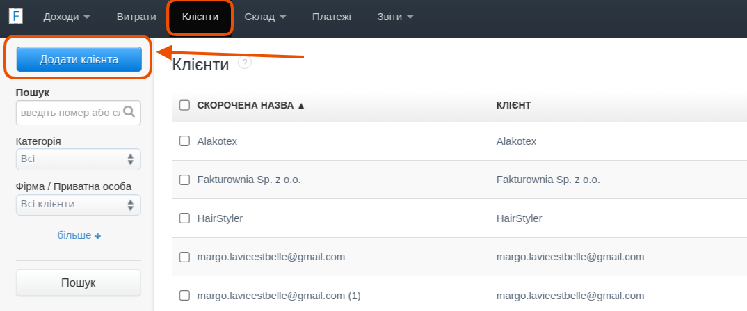 - створіть нового клієнта за допомогою кнопки "Додати клієнта" або натисніть на ім'я клієнта, доступного у списку, і скористайтеся опцією редагування,