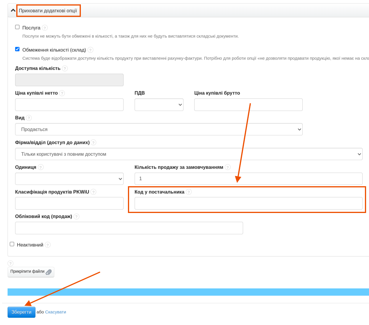 Якщо продукт має свій код у постачальника, в якого ви його купуєте, ви можете вказати його в картці продукту. Для цього: .- перейдіть до закладки Продукти або Склади > Продукти, якщо ви користуєтеся Управлінням складами;