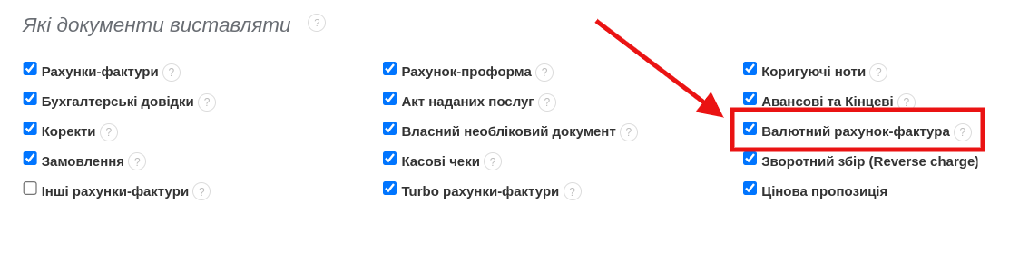Щоб скористатися цією можливістю, необхідно її попередньо активувати. Для цього оберіть Налаштування > Налаштування акаунта > Які документи виставляти, у цьому місці потрібно вибрати Валютний рахунок-фактура, а потім натиснути кнопку Зберегти.