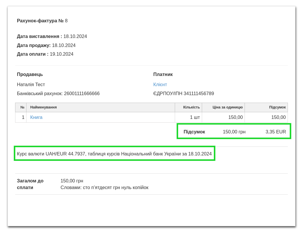 У валютному рахунку-фактурі важливо визначити основну валюту рахунку та валюту, на яку система перерахує вартість документа. Якщо основна валюта — це PLN, а ви виставите рахунок, наприклад, в EUR, система додасть на документ запис про перерахунок ПДВ і курс обміну