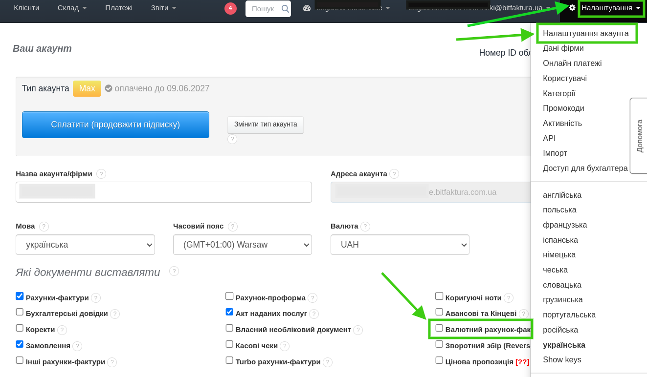 Щоб виставити валютний рахунок-фактуру у BitFaktura, спочатку необхідно активувати цей тип документа на акаунті. Для цього:
