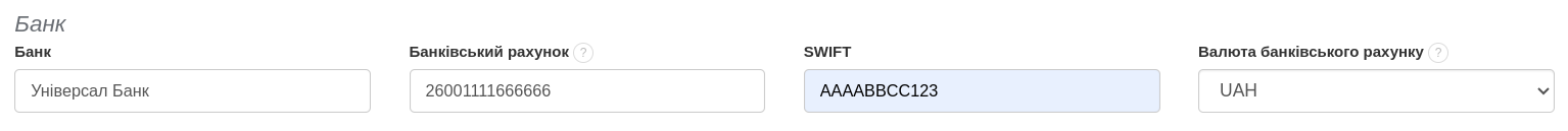 Якщо обраною формою оплати є переказ, необхідно вказати номер IBAN та SWIFT. IBAN та SWIFT можна додати, відредагувавши дані компанії у закладці Налаштування > Дані компанії.