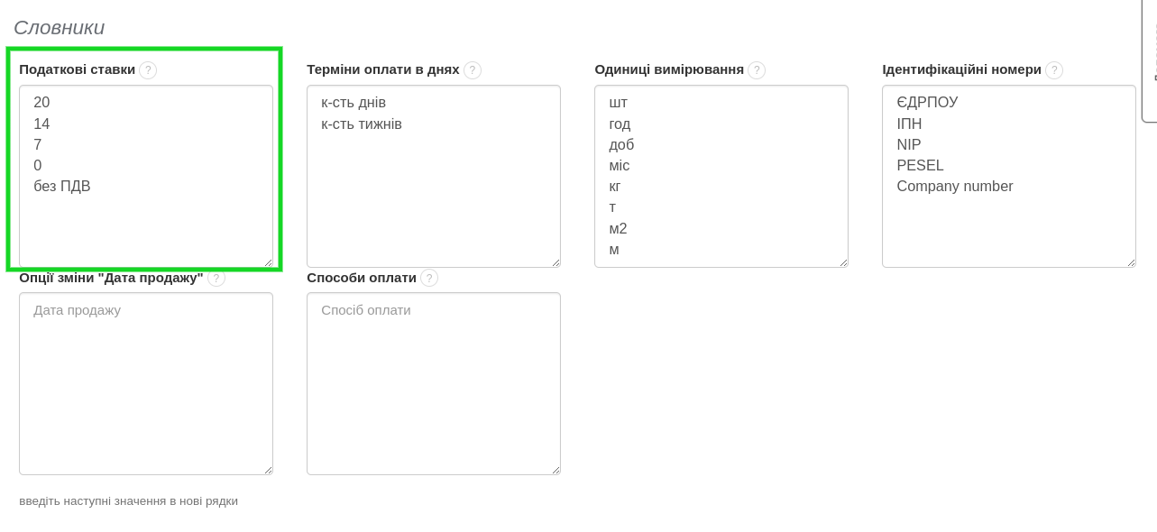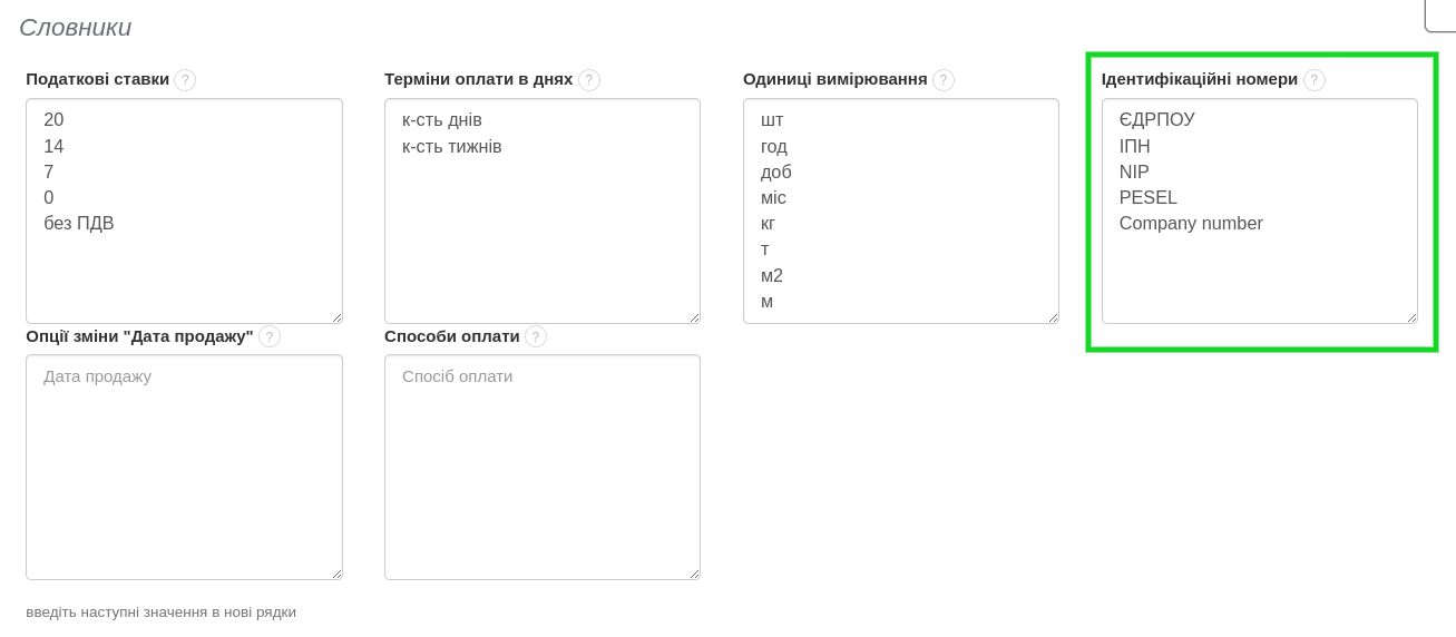 У валютному рахунку-фактурі важливим є також ідентифікаційний номер контрагента, який зазвичай має іншу назву в залежності від країни Платника. У налаштуваннях BitFaktura можна визначити необхідні ідентифікаційні номери, щоб вони відповідали назві у відповідній країні. Ідентифікаційні номери можна визначити самостійно, перейшовши до вкладки Налаштування > Налаштування акаунта > Конфігурація > Словники > поле Ідентифікаційні номери.