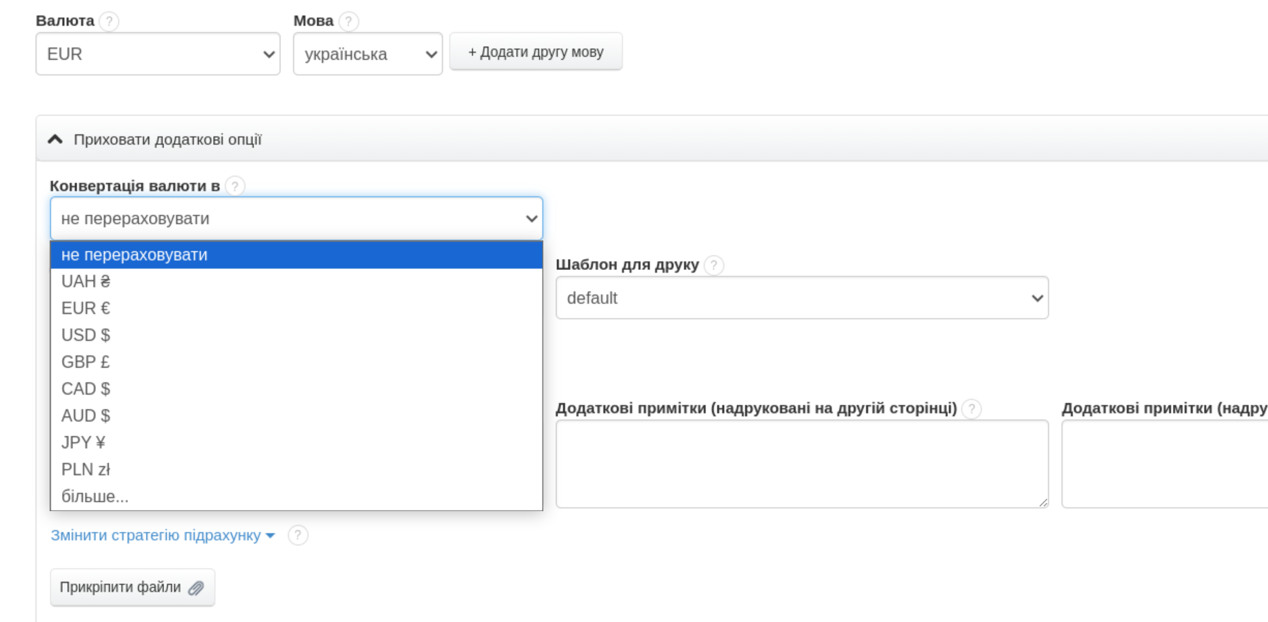 Наступним важливим елементом є визначення, звідки програма повинна отримати курс обміну валют. Валюту документа та курс обміну ви оберете на етапі створення документа. Під позиціями на рахунку-фактурі (точніше під полем Нотатки) ви знайдете рубрику Валюта. Клацніть на це поле і виберіть основну валюту документа.