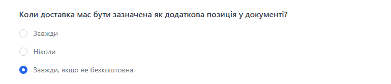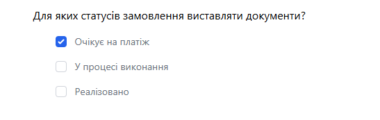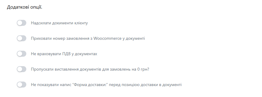 - За бажанням позначте Додаткові опції: автоматичну відправку рахунка клієнту, приховування відображення номера замовлення на рахунку або неврахування ПДВ у рахунках (ця опція дозволить створювати будь-які документи без ПДВ), пропуск створення документів для замовлень на 0 грн.