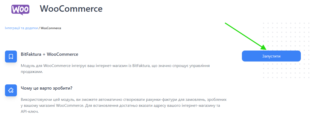 - Натисніть кнопку Запустити, щоб розпочати процес підключення вашого інтернет-магазину на WooCommerce до BitFaktura.