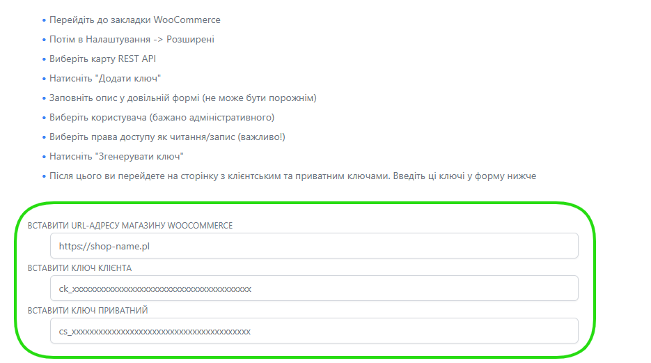 - У відповідному місці у формі додайте URL-адресу вашого магазину та заповніть клієнтський ключ і приватний ключ. УВАГА! Щоб отримати його, вам потрібно увійти до адміністративної панелі WooCommerce і діяти відповідно до вказаних там інструкцій.