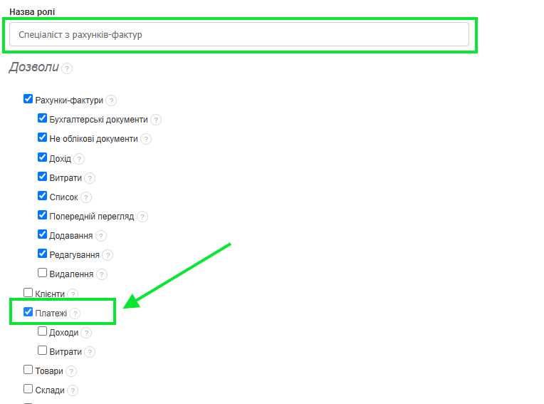 - щоб надати доступ до платежів, позначте чекбокс біля опції Платежі,