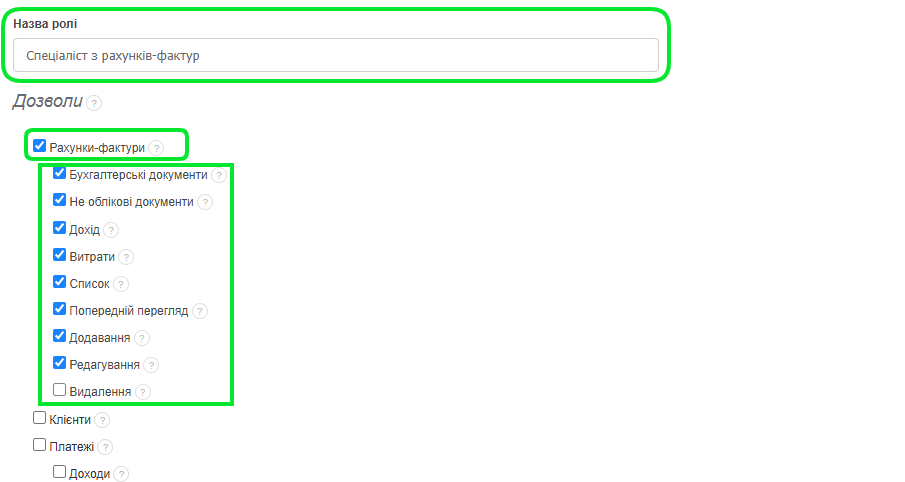 - щоб надати доступ до рахунків-фактур і управління ними, позначте чекбокс біля опції Рахунки-фактури, а також біля тих опцій, які стосуються документів, до яких користувач повинен мати доступ,