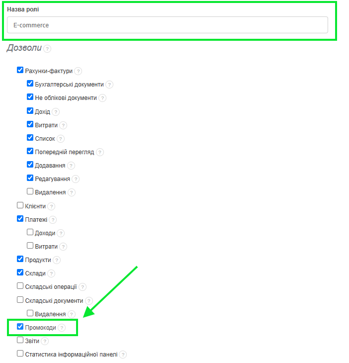 - щоб надати можливість перегляду, створення, редагування та видалення промокодів, необхідно відмітити прапорець біля опції Промокоди (щоб користувач мав доступ до промокодів, він також повинен мати доступ до закладки Платежі),