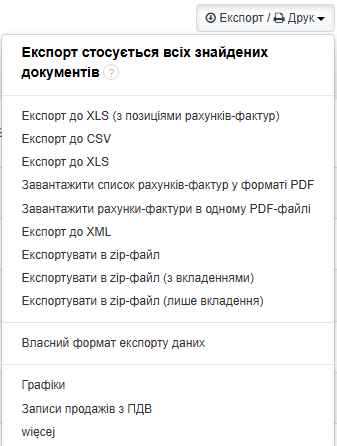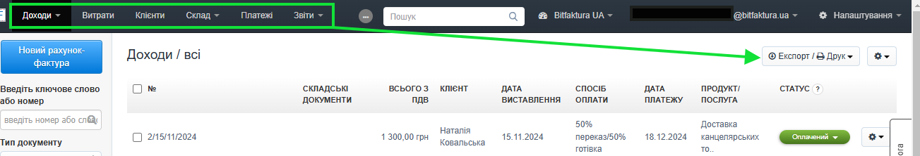 Усі дані, які ви вводите в BitFaktura, включаючи інформацію про транзакції, а також дані про клієнтів, продукти та платежі, можуть бути експортовані з системи. Доступ до опції експорту можна знайти у правому верхньому куті вікна зі списком даних, перейшовши до вибраної закладки у верхньому меню системи (наприклад, Доходи):