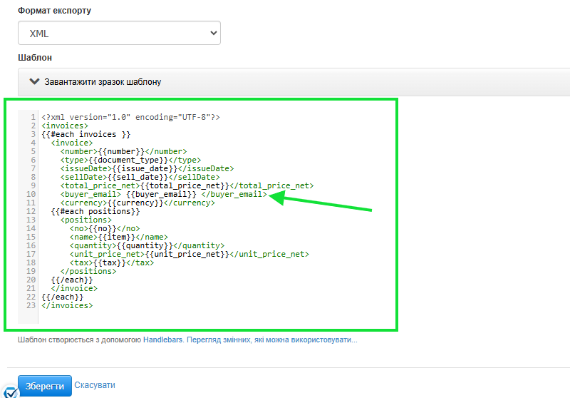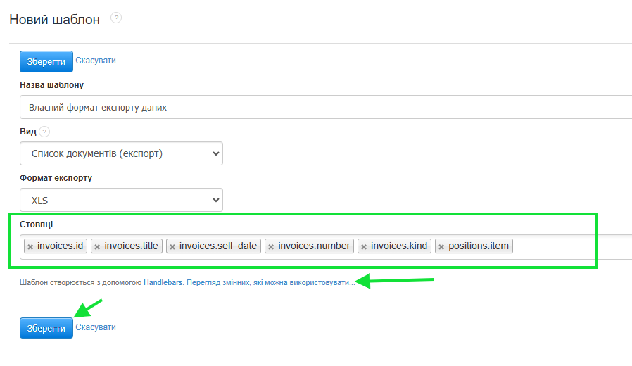 - Залежно від обраного формату, у відповідному полі заповніть змінні, які система повинна зчитати під час експорту (для опцій .CSV та .XLS у полі Стовпці додайте відповідні змінні, що відповідають даним, які потрібно експортувати);