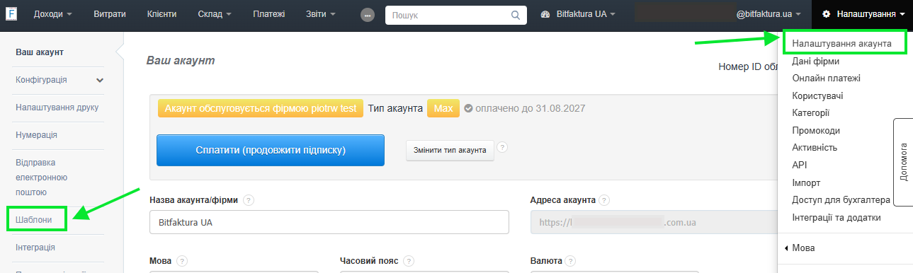 - перейдіть до закладки Налаштування > Налаштування акаунта > Шаблони;