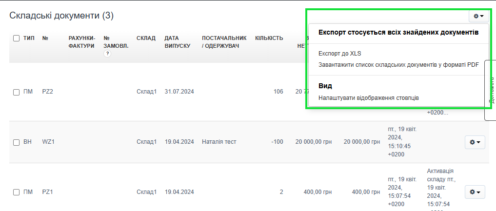 Контекстне меню у списку складських документів дозволяє експортувати дані у доступні формати або налаштувати відображення стовпців у списку. У цьому записі ми вкажемо, де воно доступне та які опції дозволяє використовувати.