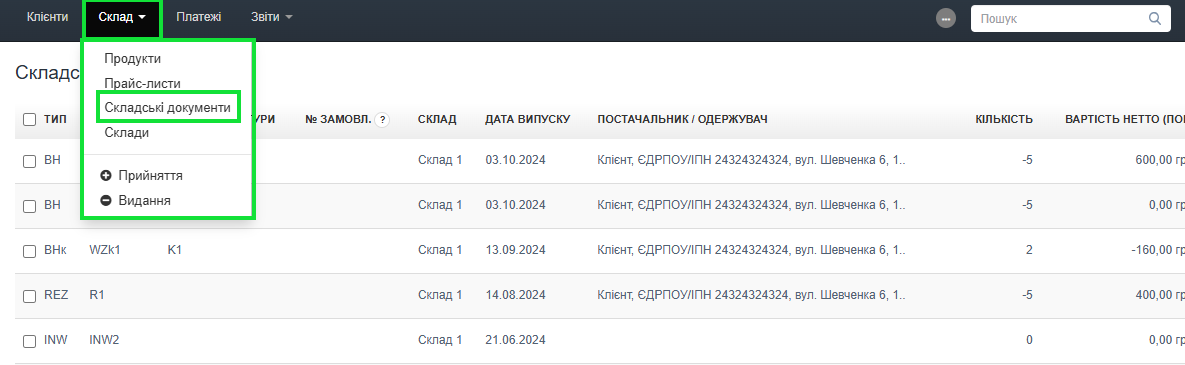 Щоб мати можливість скористатися контекстним меню:- перейдіть до закладки Склад > Складські документи – у цьому розділі система відобразить список складських документів, створених у межах акаунта;