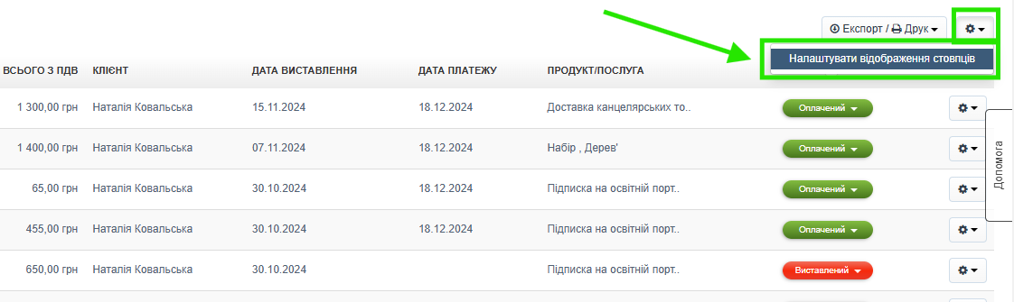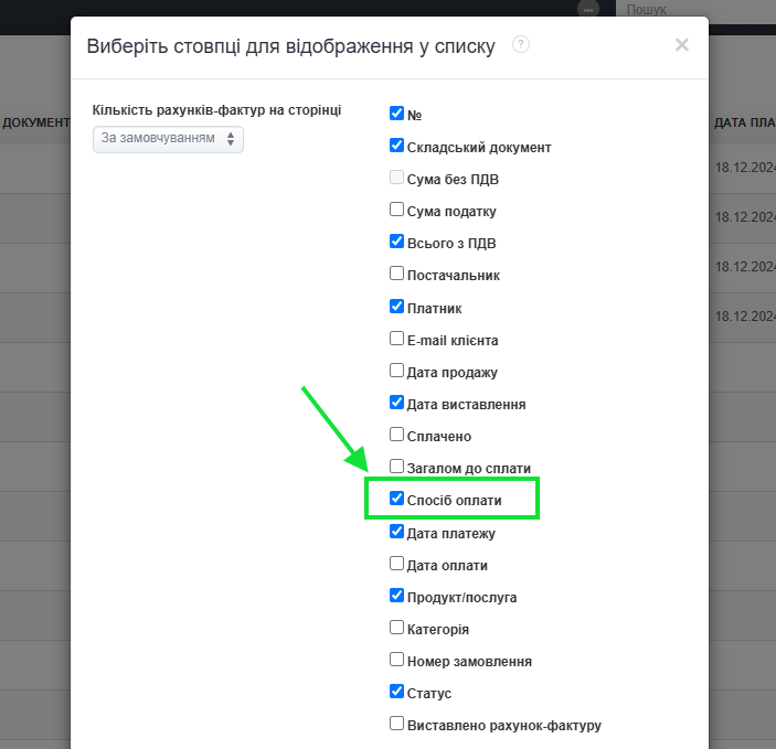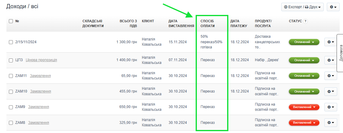 - у списку документів з'явиться додатковий стовпець, де ви зможете перевірити спосіб оплати, призначений до рахунка-фактури.