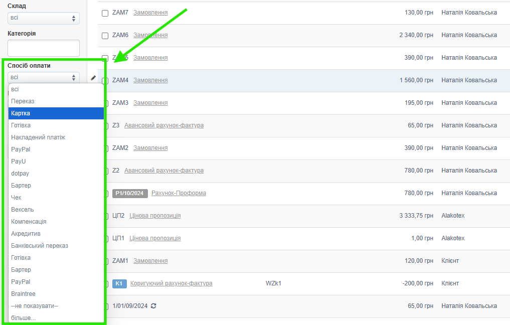 - на панелі фільтрів ліворуч від списку знайдіть поле Спосіб оплати;