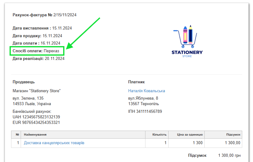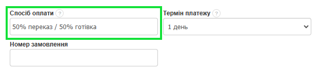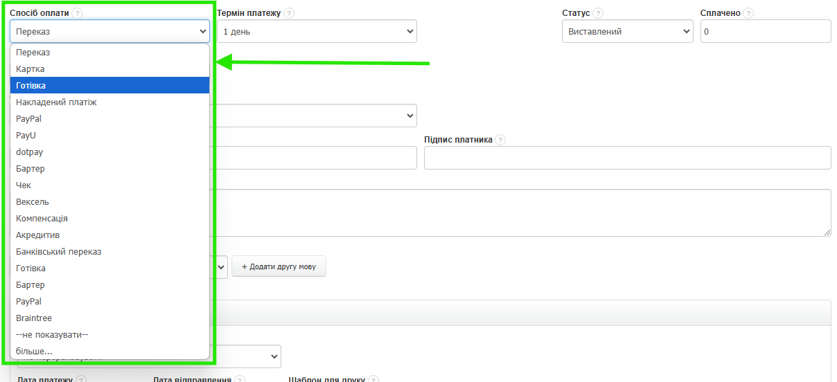 - у полі Спосіб оплати виберіть відповідну для вашого випадку форму оплати;