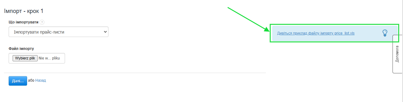 Після переходу до закладки Налаштування > Імпорт > Імпорт прайс-листів на синьому тлі доступний приклад файлу для імпорту прайс-листів, який можна завантажити та заповнити власними даними.