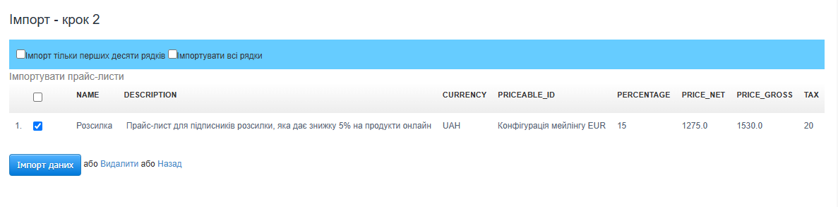 Імпорт прайс-листа