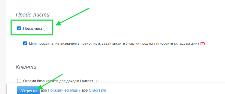 - поставте прапорець біля опції Прайс-листи;