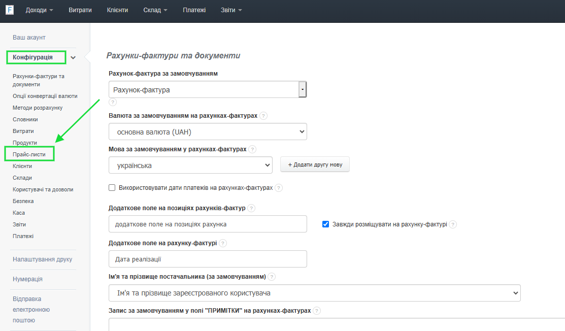 - перейдіть до закладки Налаштування > Налаштування акаунта > Конфігурація > Прайс-листи;