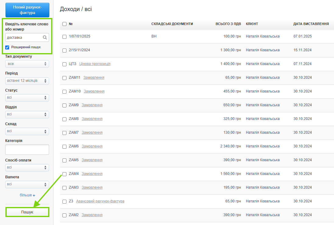 Існує можливість розширення пошуку рахунків-фактур за фразами, доданими, наприклад, у поле для приміток. Ви також можете розширити пошук за фразами з розділу Примітки. Щоб скористатися функцією розширеного пошуку: