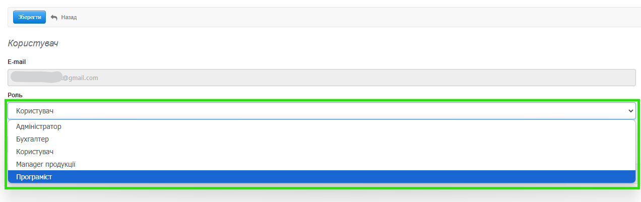 Створену в акаунті роль можна призначити новому користувачеві з рівня форми додавання. Власну роль також можна змінити для вже доданого користувача.