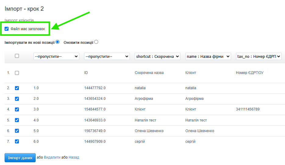 - Позначте чекбокс біля опції Файл містить заголовок, щоб система пропустила перший рядок файлу з заголовками стовпців під час імпорту,