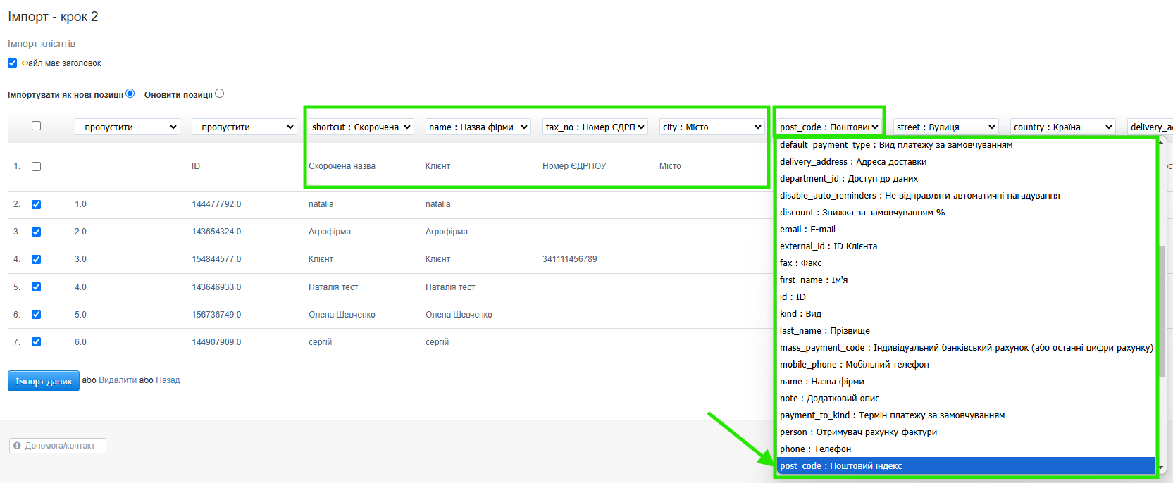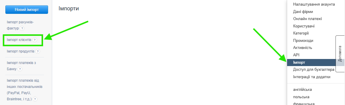 - потім перейдіть до закладки Налаштування > Імпорт і зі списку імпортів виберіть Імпорт клієнтів,