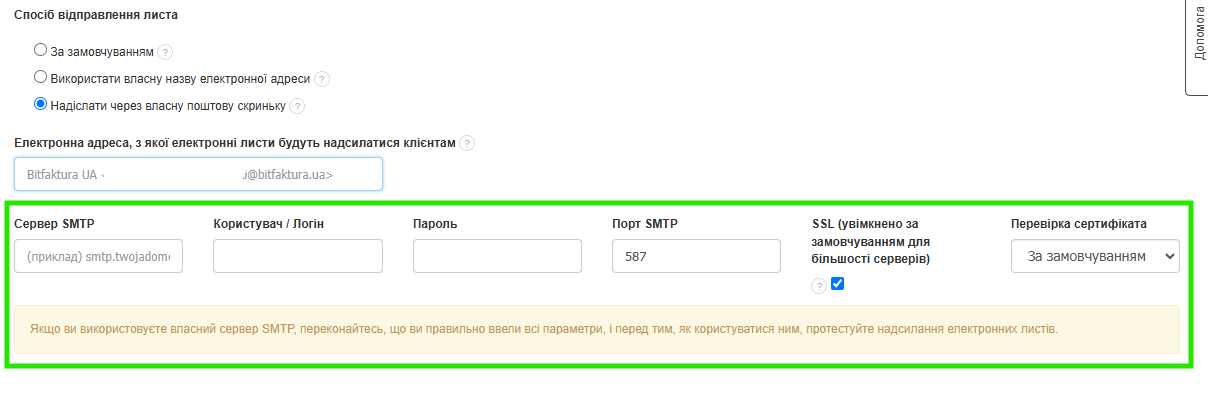 ВАЖЛИВО! При використанні надсилання через власний сервер статус відправки в BitFaktura є частковим. Це означає, що він вказує лише на доставку або недоставку повідомлення на сервер користувача, який використовує цю опцію. Якщо рахунки-фактури не доходять до клієнтів, слід перевірити на власному сервері, яка помилка виникла при взаємодії з поштовим сервером контрагента.
