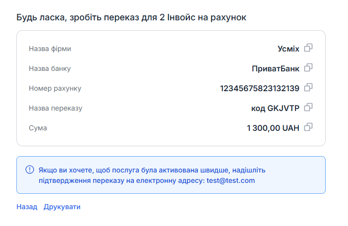- Система відобразить реквізити для переказу згідно з шаблоном, який ви встановили у закладці Налаштування > Онлайн платежі > Банківський переказ;