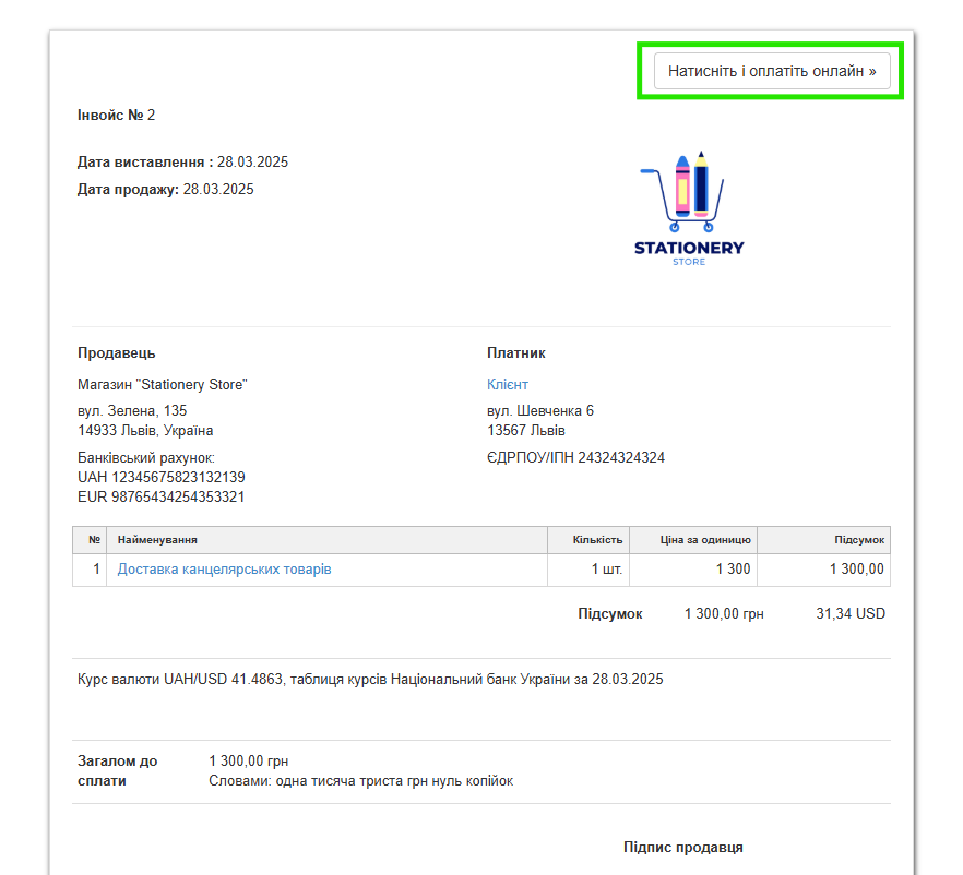 - у правому верхньому куті рахунку з’явиться кнопка, яка перенаправить вашого контрагента до сторінки оплати;