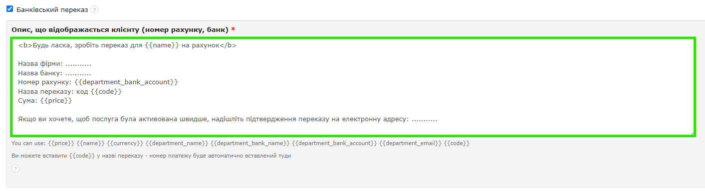 - у полі Опис, що відображається клієнту (номер рахунку, банк) ви побачите приклад тексту, який відображатиметься вашому клієнту, якщо він скористається кнопкою Натисніть і сплатіть онлайн у рахунку-фактурі та вибере цю форму оплати — заповніть місця з крапками своїми даними або створіть власний текст і збережіть зміни;