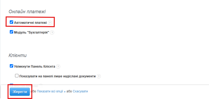 Щоб увімкнути інтеграцію з PayPal:- перейдіть до закладки Налаштування > Налаштування акаунта > Ваш акаунт і в розділі Онлайн платежі виберіть опцію Автоматичні платежі - підтвердьте зміни в налаштуваннях акаунта кнопкою Зберегти — опція Автоматичні платежі доступна починаючи з тарифного плану Standard,