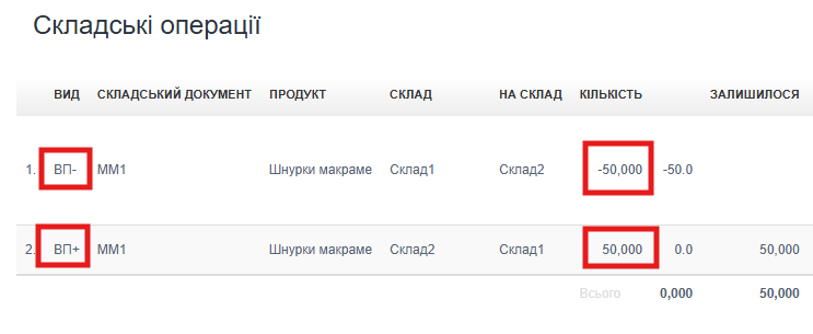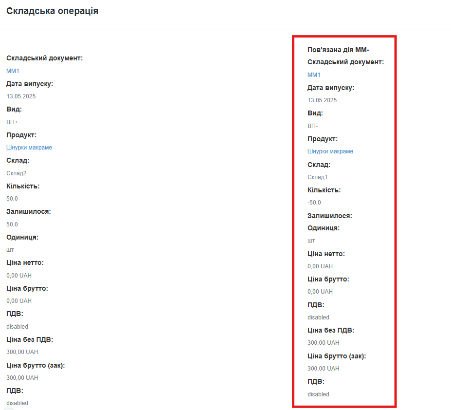 Наприклад: якщо натиснути на операцію ВП+, то в детальному описі буде показано складський документ MM1 та відповідну операцію ВП- (ММ-).