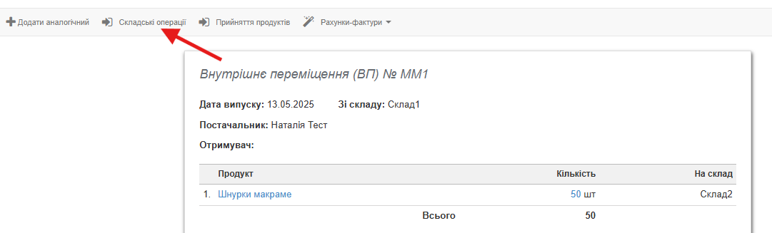 Щоб наразі створити документ ВП (внутрішнє переміщення), з метою переміщення запланованої кількості товару на інший склад, слід: