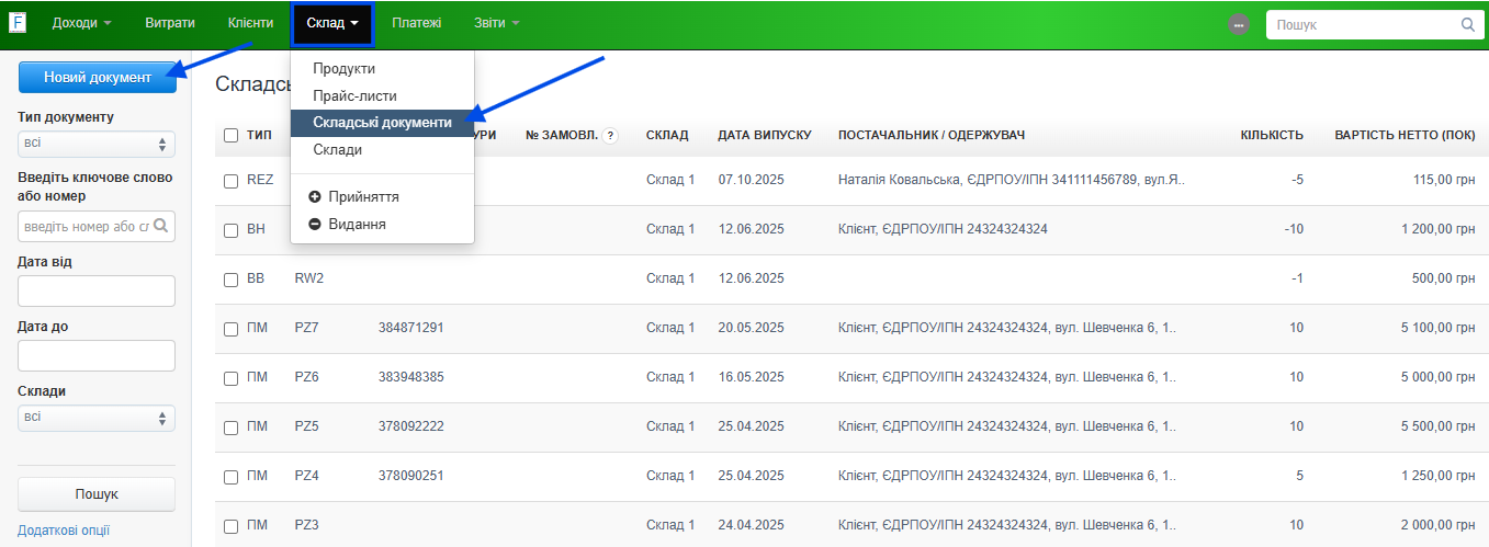 - перейдіть до закладки Склад > Складські документи > Новий документ;