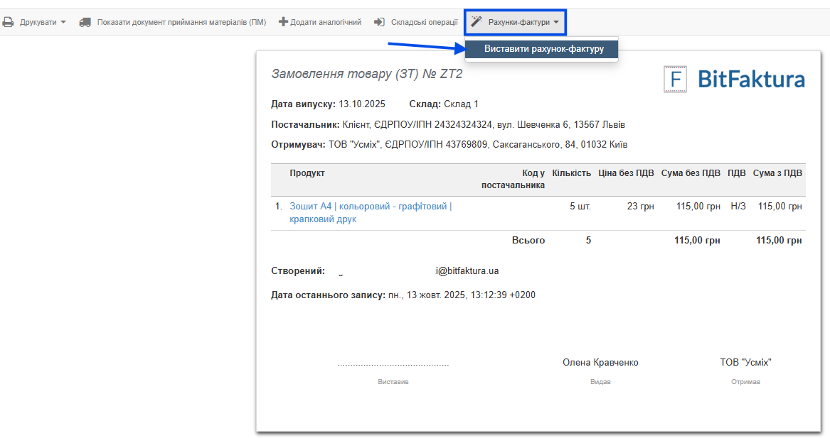 Зі створеного документа замовлення товару (ЗТ) ви можете безпосередньо виставити витратний рахунок-фактуру. Для цього в контекстному меню над складським документом виберіть опцію Рахунки-фактури > Створити рахунок-фактуру. Система скопіює дані у форму. Підтвердьте створення рахунку кнопкою Зберегти. Рахунок-фактура, створена таким способом, буде пов’язана з документом ЗТ.
