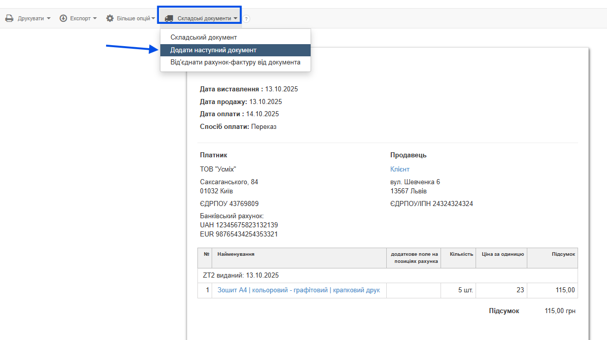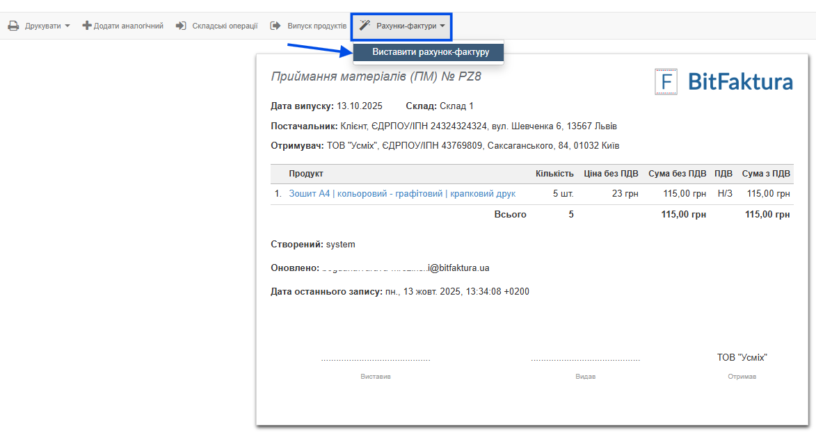 На основі створеного таким чином ПМ ви можете швидко виставити витратний рахунок-фактуру. У контекстному меню над створеним ПМ виберіть опцію Рахунки-фактури > Виставити рахунок-фактуру.