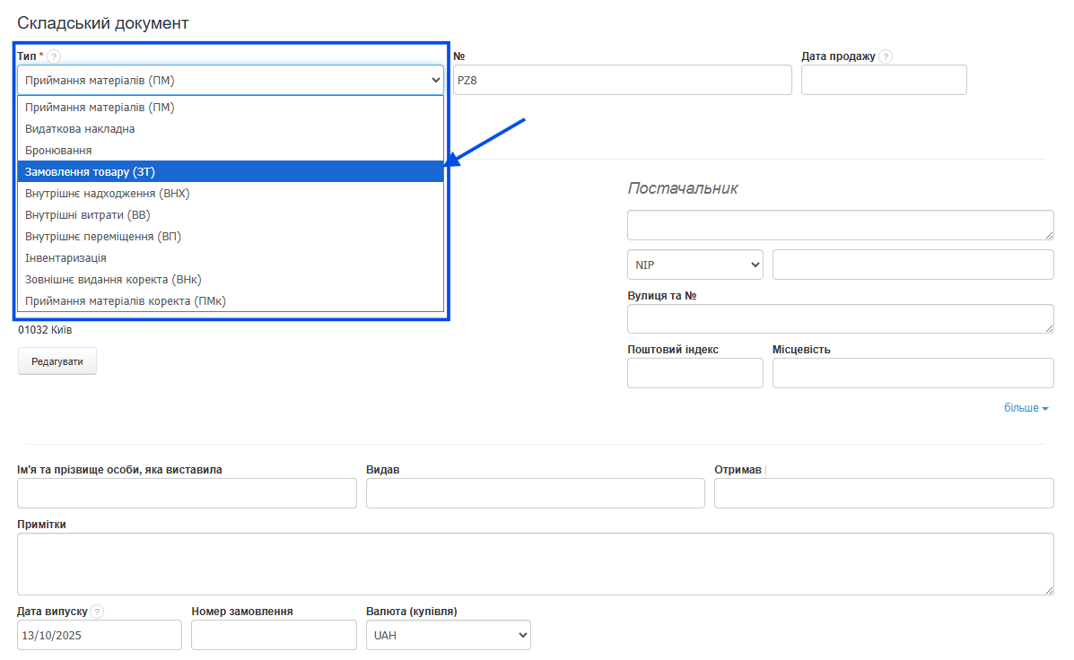 - у полі Тип виберіть зі списку Замовлення товару (ЗТ);