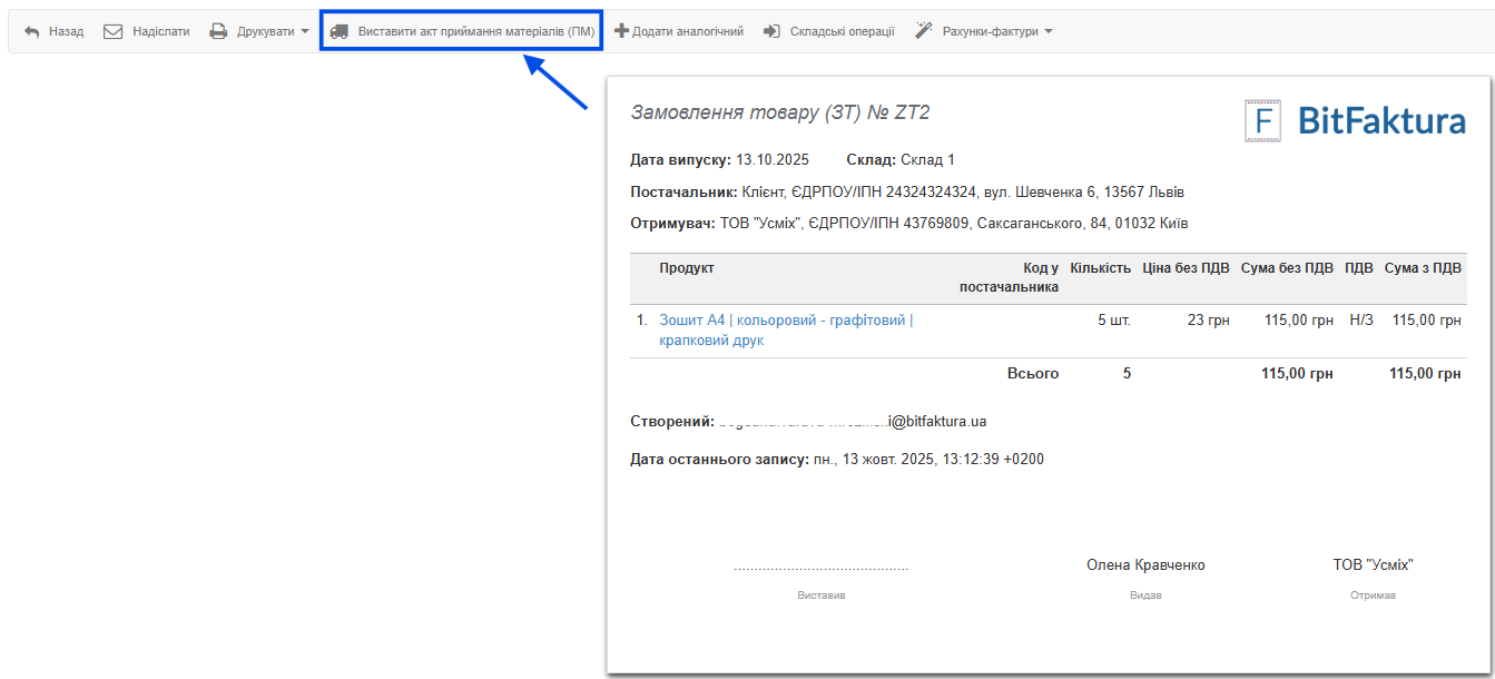 До рахунка-фактури, створеного таким способом, ви також можете додати складський документ ПМ — прийняття матеріалів.