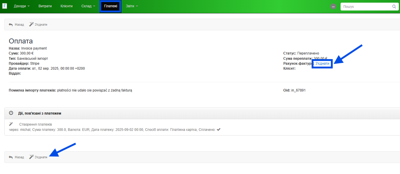 - транзакції зі Stripe, додані як платежі, прив’язані до відповідних рахунків, знаходяться у закладці Платежі