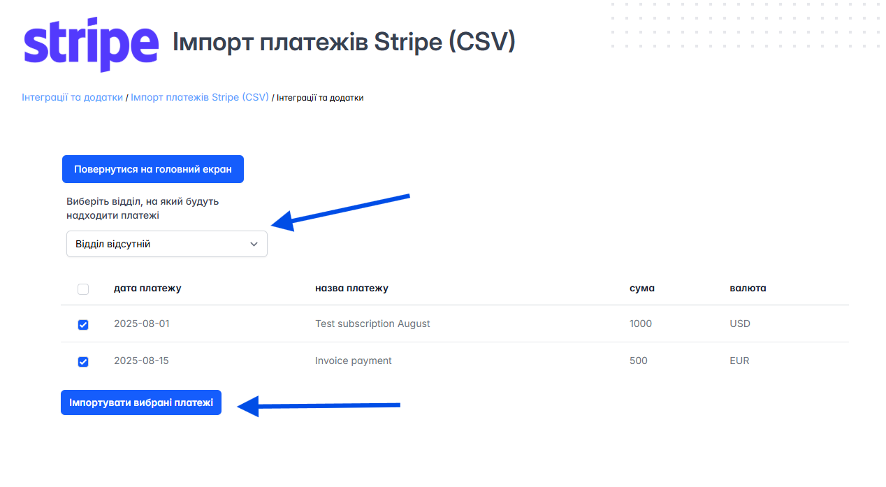 - після того, як система завершить конвертацію, з’явиться кнопка Імпортувати вибрані платежі, а також опцію вибору відділу, до якого мають надійти платежі