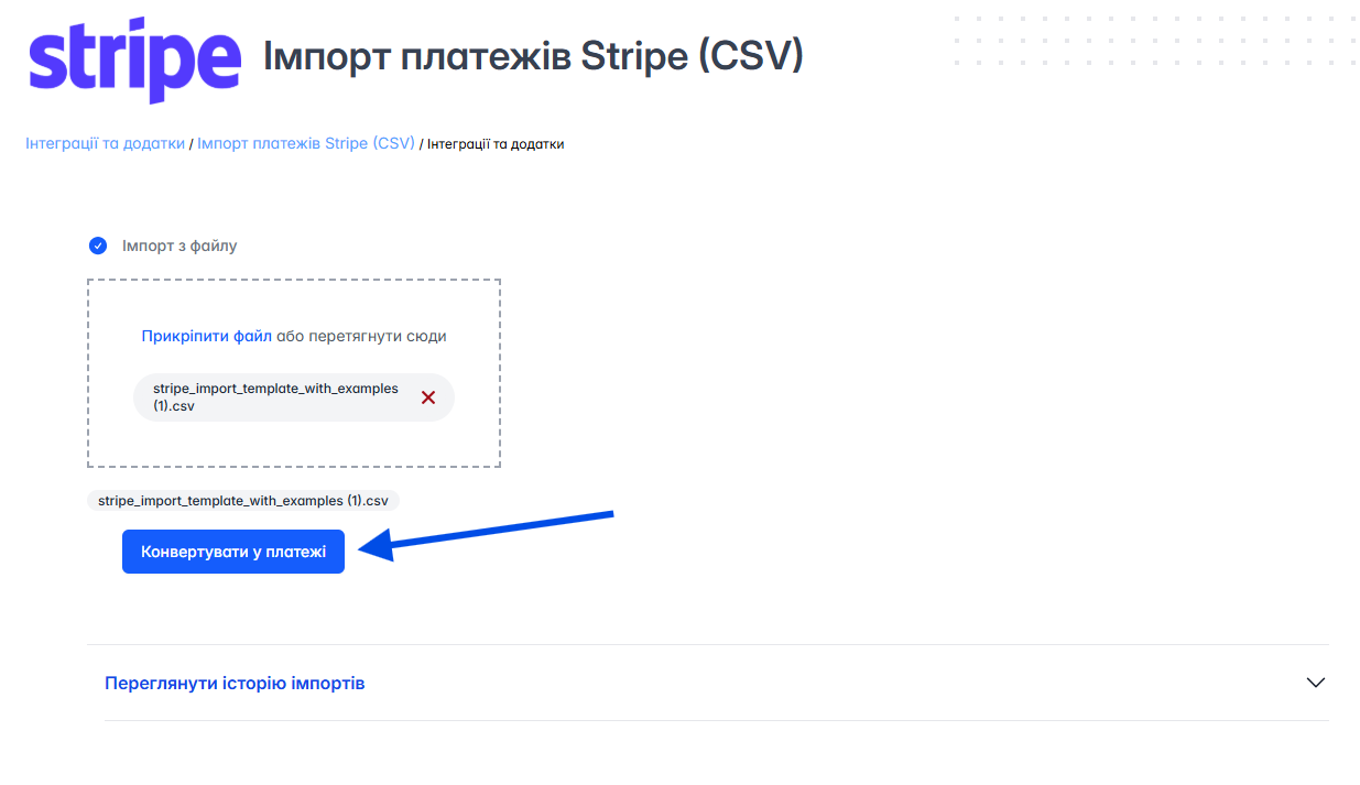 - перейдіть до Налаштування > Інтеграції і додатки > Імпорти > Stripe
